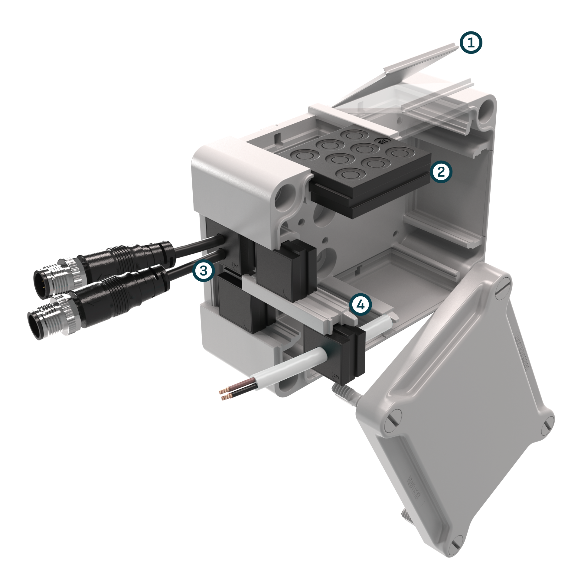 DES DIVIA permet d’enlever les flancs (1) en fonction des exigences de câblage. Dans chaque ouverture, il est possible d’insérer un joint passe-câble SPL (2) pour câbles jusqu’à 31mm de diamètre, ou 4 joints passe-câble SPC (3) pour câbles jusqu’à 15mm de diamètre, grâce aux séparateurs (4).